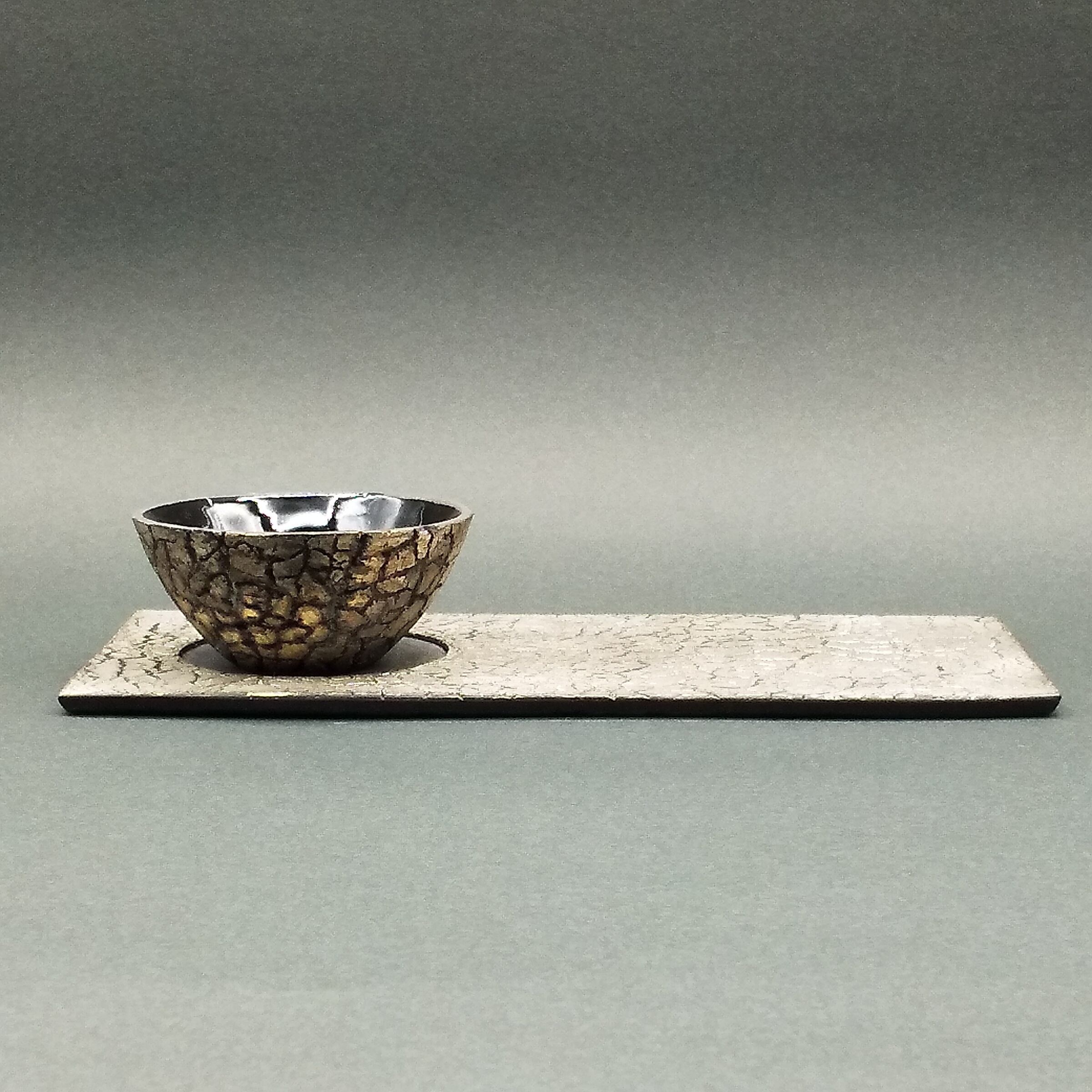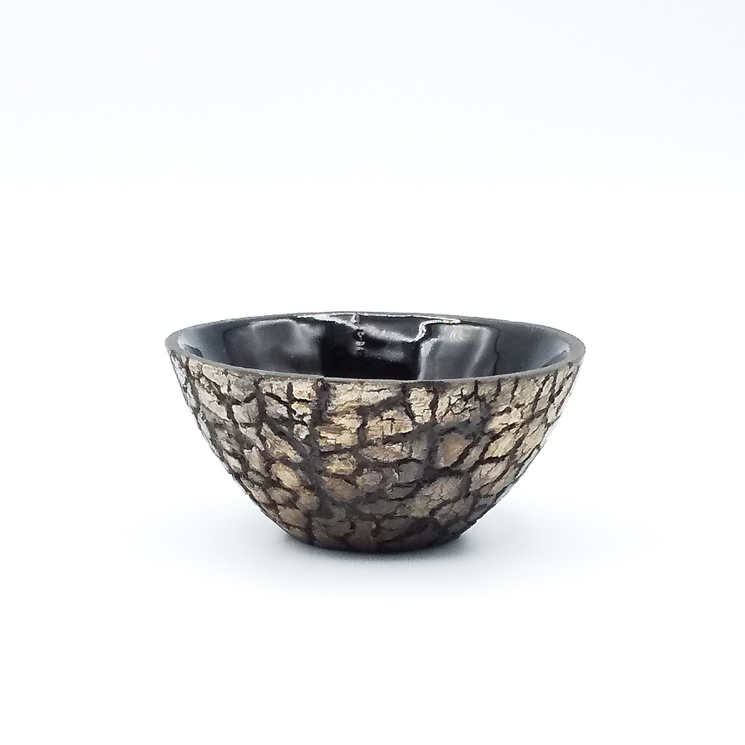 小ぶりなフォルムにヒビのテクスチャー、外側のくすんだシルバーと内側の黒ツヤのコントラストがスタイリッシュなとても上品なぐいのみです。